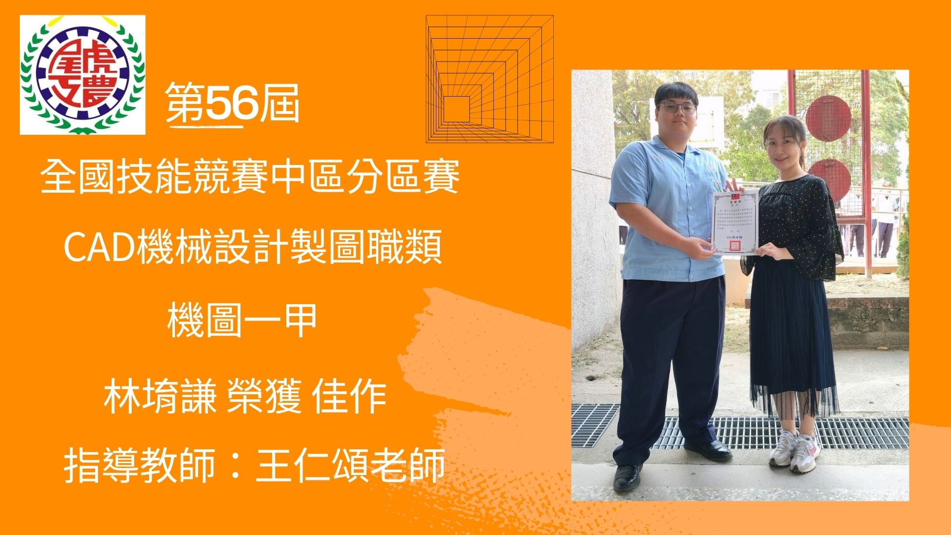 - 賀機圖一林堉謙參加第56屆全國技能競賽中區分區技能競賽CAD機械設計製圖職類榮獲佳作