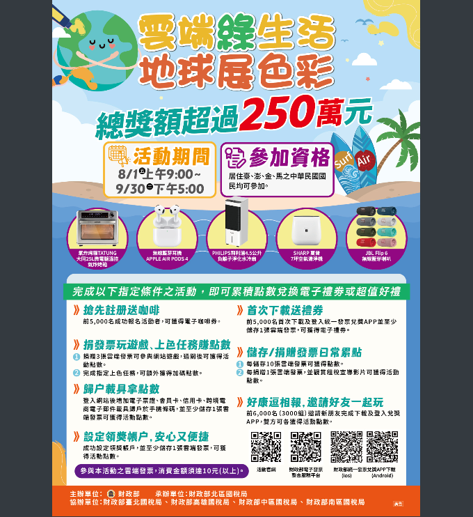 轉公告財政部北區國稅局114年度結合統一發票推行辦理全國性推廣活動─「雲端綠生活 地球展色彩」,請查照。Post author:訓育組長Post published:2025 年 8 月 18 日Post category:學校公告如附件。來文下載下載-1下載 Post Views: 100相關內容轉知國立中興大學2026年寒假Python程式設計系列、ACP與SSE色彩學國際證照輔導、AI應用故事 X 探索島系列活動,即日起開放報名,歡迎踴躍參加。2025 年 11 月 11 日虎農校訊第22期公告2025 年 5 月 22 日轉知公益財團法人日本台灣交流協會台北事務所擬招募我國高中生赴日留學事,敬請協助公告周知,請查照。2025 年 11 月 21 日