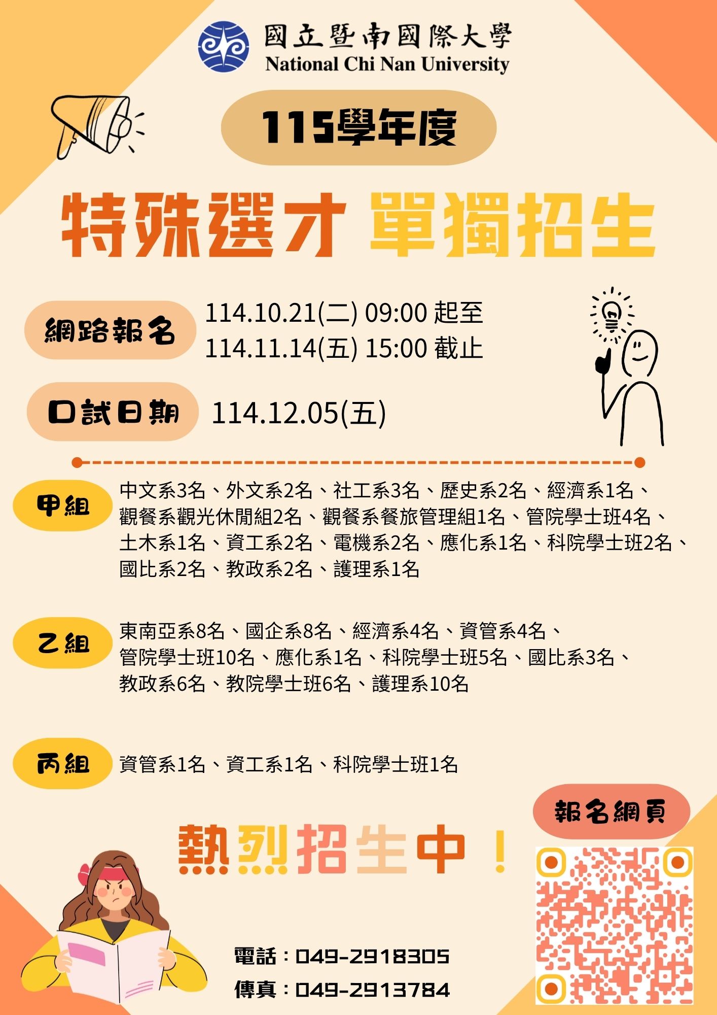 轉知國立暨南國際大學115學年度特殊選才單獨招生訊息Post author:hwaivsylc048Post published:2025 年 10 月 13 日Post category:學校公告1141006659-0-0下載特殊選才單獨招生 – 1下載 Post Views: 11相關內容國立臺南大學教育學系辦理「2025 台灣教育傳播暨科技學會年會暨教育高階論壇國際學術研討會」相關徵稿資訊。2025 年 6 月 26 日轉知教育部委託財團法人台灣設計研究院辦理113年度「學美.美學-校園美感設計實踐計畫」成果展覽。2025 年 6 月 18 日公告本校114學年雲林區實用技能學程分發錄取生榜單及相關事項2025 年 6 月 13 日