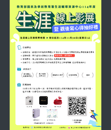 國教署委託國立中興大學附屬高級中學辦理「114年度生涯影展」活動實施計畫及宣傳電子海報1份,鼓勵師生踴躍參加