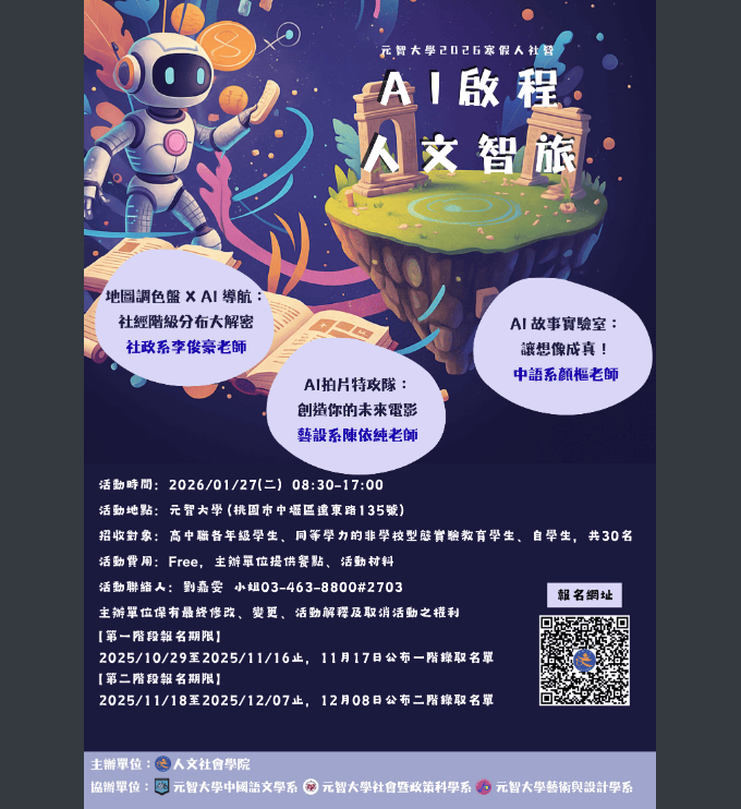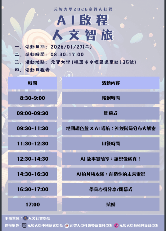 轉知「元智大學2026寒假人社營-AI啟程:人文智旅」活動,請查照。Post author:hwaivsylc024Post published:2025 年 10 月 29 日Post category:學校公告「元智大學2026寒假人社營-AI啟程:人文智旅」活動-來文下載「元智大學2026寒假人社營-AI啟程:人文智旅」活動-附件一下載「元智大學2026寒假人社營-AI啟程:人文智旅」活動-附件二下載 Post Views: 9相關內容國立中央大學臺灣太空科學聯盟謹訂於本(114)年10月26日(星期日)09:00~18:00,於本校研究綜合大樓暨大禮堂(教研大樓)和羅家倫講堂舉辦「第七屆衛星科學工作坊暨臺灣太空科學聯盟學生日」活動(海報如附件),鼓勵學生踴躍參加!2025 年 10 月 21 日公告本校114-1開學日行程表。2025 年 8 月 21 日轉知國立臺灣科技大學辦理「數位雙生XR技術實作與資安防護鑑識實務研習營」,請查照。2025 年 6 月 26 日