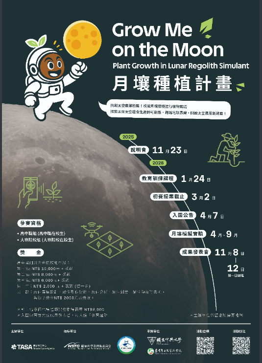 轉知國家太空中心「Grow Me on the Moon-月壤種植」活動,報名即日起至2026年3月2日止,歡迎踴躍參加。Post author:hwaivsylc024Post published:2025 年 10 月 31 日Post category:學校公告國家太空中心「Grow-Me-on-the-Moon-月壤種植」活動-來文下載國家太空中心「Grow-Me-on-the-Moon-月壤種植」活動-附件一下載國家太空中心「Grow-Me-on-the-Moon-月壤種植」活動-附件二下載 Post Views: 9相關內容弘光科技大學113年開設6門磨課師(MOOCs)課程,即日起開放免費 修習2024 年 8 月 28 日主旨:國立虎尾科技大學辦理「114年技職永續破風者計畫—技之勇者職業試探體驗系列活動:技職推廣市集」,敬邀貴校報名參與設攤推廣,請查照。2025 年 10 月 27 日檢送「教育部國民及學前教育署推動高級中等學校學生學習歷程檔案114年度學生學習歷程檔案分享會系列活動第2場次分享會實施計畫」,請協助公告周知,並鼓勵師生及家長踴躍報名參加,請查照。2025 年 10 月 13 日