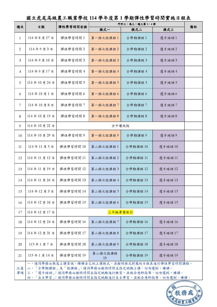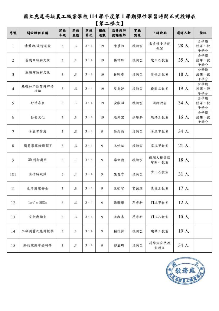 11/5日起高三彈性課程第二梯次上課時間 、課程與地點Post author:hwaivsylc007Post published:2025 年 11 月 3 日Post category:學校公告 Post Views: 26相關內容主旨:國立中正大學訂於114年12月12日(星期五)辦理「2025 法遵科技與電腦稽核專題—數位柯南AI稽核法遵創新體驗」活動,邀請師生踴躍參加,請查照。2025 年 9 月 16 日轉知台南應用科技大學「2025 TUTech藝術季」活動,歡迎踴躍報名參加。2025 年 10 月 7 日轉知公益財團法人日本台灣交流協會「2026年度日本台灣交流協會日本獎學金留學生(學部)」申請資訊2025 年 7 月 28 日