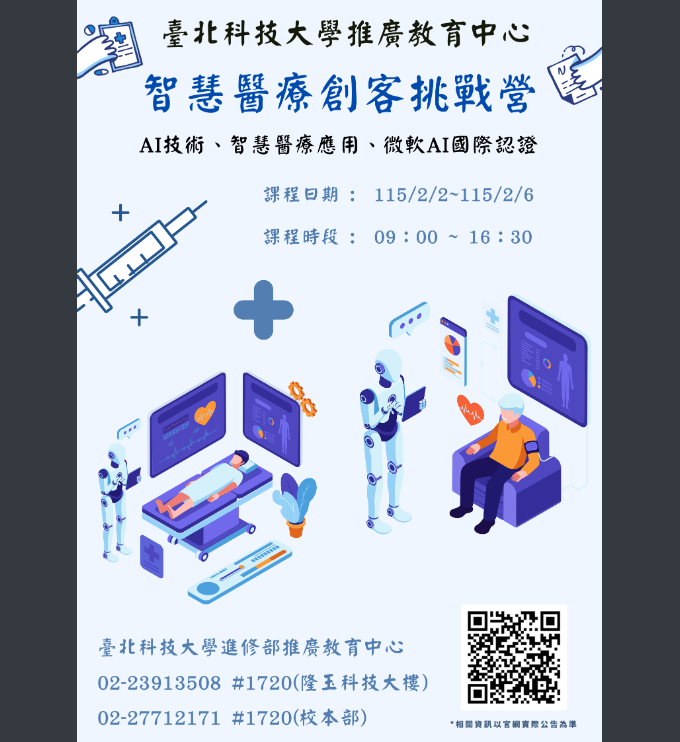 轉知國立臺北科技大學進修部推廣教育中心開辦【智慧醫療創客挑戰營】活動,歡迎踴躍報名參加。Post author:hwaivsylc024Post published:2025 年 11 月 18 日Post category:學校公告國立臺北科技大學進修部推廣教育中心開辦【智慧醫療創客挑戰營】-來文下載國立臺北科技大學進修部推廣教育中心開辦【智慧醫療創客挑戰營】-附件下載 Post Views: 7相關內容轉知台南應用科技大學「2025 TUTech藝術季」活動,歡迎踴躍報名參加。2025 年 10 月 7 日公告edu磨課師+(教育部磨課師)平臺正確客服資訊2025 年 11 月 17 日「全民英檢」中級聽讀/一日考開放報名中,免費備考資源「全民英檢 i學網」(GEPT iPrep)提供完整聽讀模擬試題並即時獲AI診斷回饋與個人化強弱項分析。2025 年 5 月 20 日