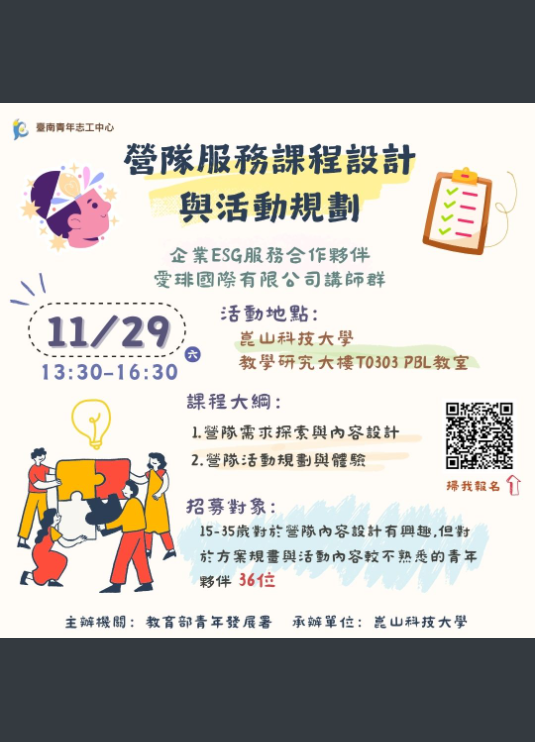 轉知臺南青年志工中心舉辦之「營隊服務課程設計與活動規劃」志工培力課程,歡迎踴躍報名參加。Post author:hwaivsylc024Post published:2025 年 11 月 19 日Post category:學校公告臺南青年志工中心舉辦之「營隊服務課程設計與活動規劃」志工培力課程-來文下載臺南青年志工中心舉辦之「營隊服務課程設計與活動規劃」志工培力課程-附件一下載臺南青年志工中心舉辦之「營隊服務課程設計與活動規劃」志工培力課程-附件二下載 Post Views: 7相關內容轉知大葉大學115學年度特殊選才招生考試相關訊息2025 年 10 月 27 日轉知經濟部彰濱產業園區服務中心(鹿港、線西、崙尾)周遭海域水深危險,不宜從事水上活動。2025 年 5 月 28 日公告實施本校檔案分類號與保存年限區分表2024 年 2 月 15 日