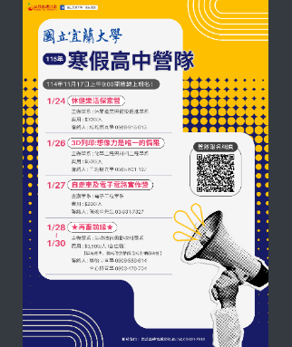 一、檢附活動海報乙份,完整訊息請至活動網站(網址:https://sites.google.com/ems.niu.edu.tw/115winter),或由國立宜蘭大學首頁(網址:https://www.niu.edu.tw)/招生資訊/在宜大夢想起飛/高中營隊查詢。