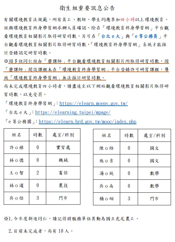 環境教育重要訊息公告Post author:學務處Post published:2025 年 12 月 2 日Post category:學校公告 Post Views: 13相關內容即測即評即發證延期通告2025 年 7 月 8 日主旨:國立中興大學生物產業管理進修學士學位學程舉辦「2025興大盃全國製茶技術競賽」,敬邀相關學生組隊參加,請查照。2025 年 9 月 10 日主旨:原住民族委員會「114年度原住民族青年暑期工讀計畫」及職缺總表各1份,請查照。2025 年 2 月 24 日