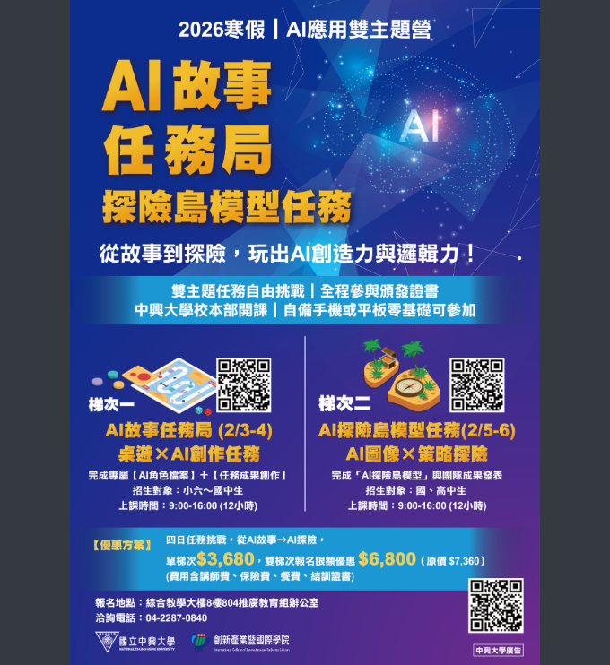 轉知國立中興大學辦理推廣教育課程115年寒假「AI應用-AI故事任務局及AI探險島模型任務」活動,歡迎踴躍報名參加。Post author:hwaivsylc024Post published:2025 年 12 月 4 日Post category:學校公告國立中興大學辦理推廣教育課程115年寒假「AI應用-AI故事任務局及AI探險島模型任務」活動-來文下載國立中興大學辦理推廣教育課程115年寒假「AI應用-AI故事任務局及AI探險島模型任務」活動-附件一下載國立中興大學辦理推廣教育課程115年寒假「AI應用-AI故事任務局及AI探險島模型任務」活動-附件二下載 Post Views: 8相關內容113年度臺灣女孩日系列宣導活動『偏見眼鏡行』線上主題展覽及引導教材2024 年 12 月 23 日轉知大葉大學原住民族學生資源中心辦理「拾舞夜-歡聲笑語在今夜」活動,歡迎踴躍報名參加。2025 年 12 月 3 日公告本校114學年度特色招生續招錄取名單。2025 年 7 月 27 日