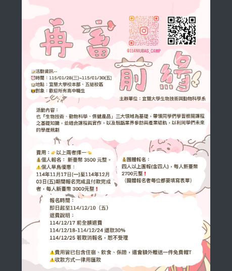 國立宜蘭大學生物技術與動物科學系舉辦114年學年度高中生寒假營隊「再畜前緣」,鼓勵同學踴躍報名參加!Post author:輔導室Post published:2025 年 12 月 8 日Post category:學校公告一、活動時間:115年1月28日(三)至1月30日(五)。二、地點:國立宜蘭大學。三、活動連絡人:吳怡亭同學/0909588614、李心妤同學/0903470704。「再畜前緣」活動公告 Post Views: 92相關內容本校114學年第1學期「友善校園週」宣導主題為「停!聽!看!一起『調』出『和』諧的友善校園!」2025 年 8 月 22 日主旨:崑山科技大學資訊傳播系舉辦「思科CCST IT Support 核心能力研習」,鼓勵相關學科教職員生踴躍報名參與,請查照。2025 年 12 月 3 日「推動中小學數位學習精進方案」114年教育部主管高級中等學校 B5-2生成式AI融入學科領域教學工作坊-北區場;鼓勵參加2025 年 10 月 7 日