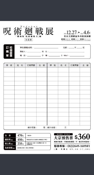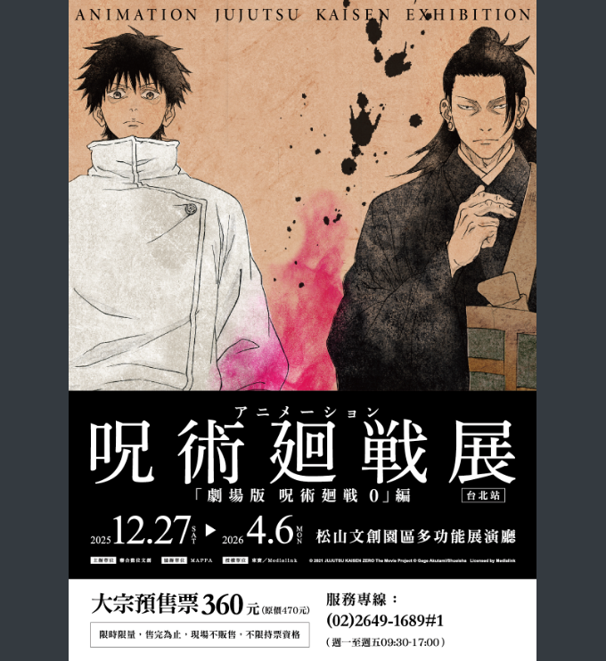 轉知聯合數位文創股份有限公司訂於114年12月27日~115年4月6日於台北市松山文創園區多功能展演廳舉辦「咒術迴戰展《劇場版 咒術迴戰 0》篇」,請查照。Post author:hwaivsylc024Post published:2025 年 12 月 17 日Post category:學校公告聯合數位文創股份有限公司訂於114年12月27日115年4月6日於台北市松山文創園區多功能展演廳舉辦「咒術迴戰展《劇場版-咒術迴戰-0》篇」-來文下載聯合數位文創股份有限公司訂於114年12月27日115年4月6日於台北市松山文創園區多功能展演廳舉辦「咒術迴戰展《劇場版-咒術迴戰-0》篇」-附件一下載聯合數位文創股份有限公司訂於114年12月27日115年4月6日於台北市松山文創園區多功能展演廳舉辦「咒術迴戰展《劇場版-咒術迴戰-0》篇」-附件二下載聯合數位文創股份有限公司訂於114年12月27日115年4月6日於台北市松山文創園區多功能展演廳舉辦「咒術迴戰展《劇場版-咒術迴戰-0》篇」-附件三下載 Post Views: 8相關內容中原大學辦理「中原大學國際雙學士學位學程」115學年度招生說明會海報1份,鼓勵有興趣之學生家長踴躍參加!2025 年 11 月 26 日公告本校114年奉准報廢財物標售案(第1次公告),請踴躍參加投標。2025 年 6 月 2 日主旨:萬能科技大學敬邀本校有興趣教師參加本校時尚造型設計系辦理「數位科技3D列印藝術工藝」,請查照。2025 年 7 月 11 日