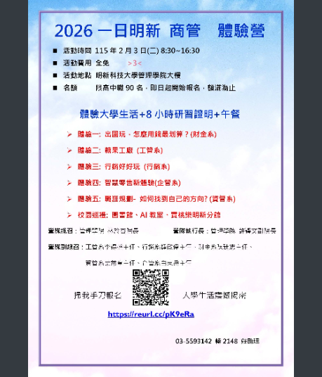 明新學校財團法人明新科技大學辦理「2026一日明新商管職涯試煉場」活動資訊,鼓勵同學踴躍參加!