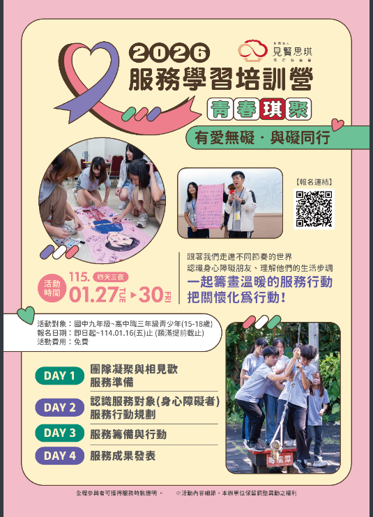 轉知財團法人見賢思琪教育基金會辦理「2026青春琪聚-有愛無礙,與礙同行」寒假服務學習培訓營,請查照。Post author:hwaivsylc024Post published:2025 年 12 月 23 日Post category:學校公告財團法人見賢思琪教育基金會辦理「2026青春琪聚-有愛無礙,與礙同行」寒假服務學習培訓營-來文下載財團法人見賢思琪教育基金會辦理「2026青春琪聚-有愛無礙,與礙同行」寒假服務學習培訓營-附件一下載財團法人見賢思琪教育基金會辦理「2026青春琪聚-有愛無礙,與礙同行」寒假服務學習培訓營-附件二下載 Post Views: 6相關內容轉公告「In My Homeland—我的家園」國際繪畫比賽,請查照。2025 年 10 月 17 日【104人力銀行】提供免費生涯講座與職人入班服務,協助學生探索未來方向,歡迎教師踴躍申請!2025 年 6 月 26 日國立新竹科學園區實驗高級中等學校辦理「A3數位素養-北區場」教師研習,鼓勵參加2025 年 9 月 15 日