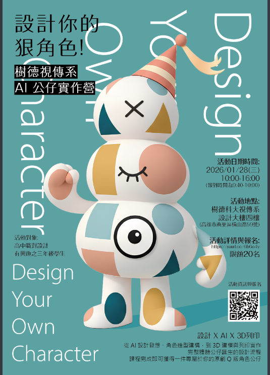 轉知樹德科技大學視覺傳達設計系舉辦寒假冬令活動營「AI公仔實作營」,請查照。Post author:hwaivsylc024Post published:2025 年 12 月 30 日Post category:學校公告樹德科技大學視覺傳達設計系舉辦寒假冬令活動營「AI公仔實作營」-來文下載樹德科技大學視覺傳達設計系舉辦寒假冬令活動營「AI公仔實作營」-附件一下載樹德科技大學視覺傳達設計系舉辦寒假冬令活動營「AI公仔實作營」-附件二下載 Post Views: 6相關內容公告本校114學年度新生訓練時程表。2025 年 8 月 12 日轉知南臺科技大學主辦2026第16屆全國高中職日語「看圖說故事」(紙芝居)比賽活動辦法,請同學組隊踴躍報名參賽。2025 年 11 月 24 日有關本校團隊或個人獲得參加114學年度全國學生音樂比賽本縣代表權,請務必完成決賽報名程序,請查照。2025 年 12 月 9 日