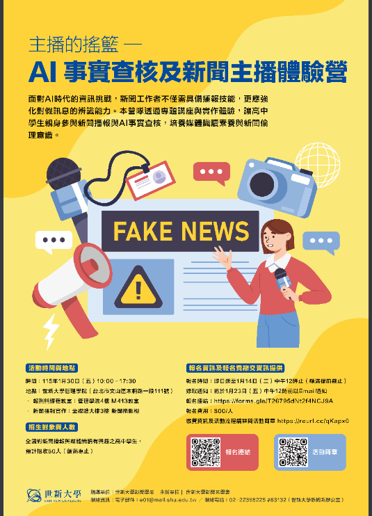 轉知世新大學舉辦「主播的搖籃—AI事實查核及新聞主播體驗營」,請查照。Post author:hwaivsylc024Post published:2026 年 1 月 9 日Post category:學校公告世新大學舉辦「主播的搖籃—AI事實查核及新聞主播體驗營」-來文下載世新大學舉辦「主播的搖籃—AI事實查核及新聞主播體驗營」-附件一下載世新大學舉辦「主播的搖籃—AI事實查核及新聞主播體驗營」-附件二下載 Post Views: 8相關內容轉知國立臺北藝術大學115學年度學士班「特殊選才」及「單獨招生」資訊2025 年 10 月 1 日轉知淡江大學學校財團法人淡江大學115學年度學士班特殊選才招生訊息2025 年 10 月 7 日轉知臺中市「2025第7屆中山堂青春競藝LIVE秀」活動,歡迎踴躍報名參加。2025 年 10 月 13 日