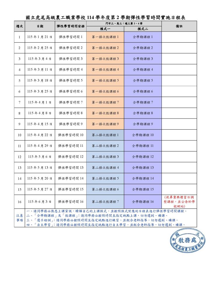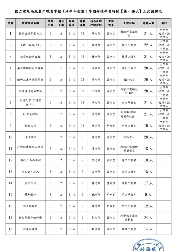 114-2彈性課程1/21(三)開始上課了,時間、課程及教室公告如下,請同學準時到所選的課程教室上課。Post author:hwaivsylc007Post published:2026 年 1 月 16 日Post category:學校公告 Post Views: 26相關內容【公告】115 學年度公立高級中等學校教師介聘作業日程表2026 年 1 月 8 日轉知臺北城市科技大學2026年寒假日本東京餐旅見學團活動,歡迎踴躍報名參加。2025 年 9 月 11 日補助「114上半年高級中等學校編制內教師參加本土語能力認證中高級以上報名費」相關事宜。2025 年 6 月 2 日