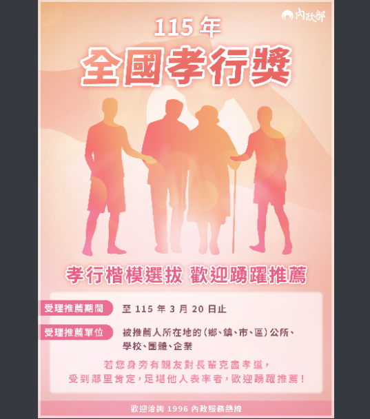 函轉內政部「115年全國孝行獎孝行楷模選拔歡迎踴躍推薦」函及宣傳圖檔,請惠予協助宣傳,請查照。Post author:訓育組長Post published:2026 年 2 月 2 日Post category:學校公告函轉內政部「115年全國孝行獎孝行楷模選拔歡迎踴躍推薦」函及宣傳圖檔,請惠予協助宣傳,請查照。下載孝行楷模下載 Post Views: 58相關內容【轉知】身心調適假說明與常見問題2024 年 9 月 3 日高中生命教育為推動數位學習已建置「適性教學教材研發實驗計劃」數位學習平臺,提供教師及師資培育生依生命教育課綱之教學及自主學習使用。2025 年 3 月 31 日主旨:函轉嘉義縣政府辦理「113學年度嘉義縣無人機競賽」第2次報名相關資訊,請貴校協助轉知並鼓勵師生踴躍報名,請查照。說明:一、依據嘉義縣政府114年7月22日府教發字第1140197735號函辦理。2025 年 8 月 4 日