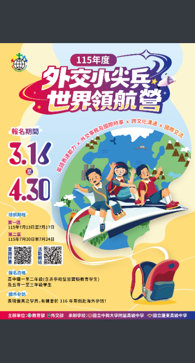 轉知教育部「115年度外交小尖兵世界領航營」實施計畫、輔導教師遴選實施計畫及宣傳海報各1份,請查照。Post author:hwaivsylc024Post published:2026 年 2 月 25 日Post category:學校公告教育部「115年度外交小尖兵世界領航營」實施計畫、輔導教師遴選實施計畫及宣傳海報各1份-來文下載教育部「115年度外交小尖兵世界領航營」實施計畫、輔導教師遴選實施計畫及宣傳海報各1份-附件一下載教育部「115年度外交小尖兵世界領航營」實施計畫、輔導教師遴選實施計畫及宣傳海報各1份-附件二下載教育部「115年度外交小尖兵世界領航營」實施計畫、輔導教師遴選實施計畫及宣傳海報各1份-附件三下載 Post Views: 8相關內容轉知文化部文化資產局辦理「2025全國古蹟日活動」,請鼓勵所屬踴躍參加,請查照。2025 年 8 月 22 日主旨:建國科技大學舉辦「2025全國智慧生活五創競賽」,敬請惠予公告並鼓勵全校師生踴躍報名參加。四、報名資訊、初賽及決賽時程詳如各競賽簡章規定。2025 年 9 月 10 日嘉藥學校財團法人嘉南藥理大學化粧品應用與管理系舉辦「美粧科學創意營」活動,鼓勵同學踴躍參加!2026 年 1 月 19 日