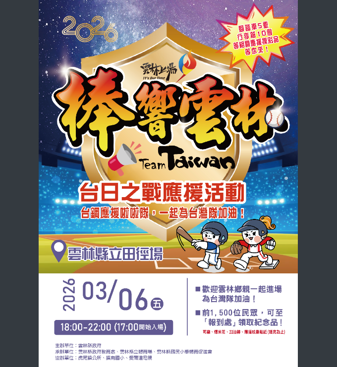 轉知雲林縣政府辦理2026世界棒球經典賽台日大戰「棒響雲林—Team Taiwan」應援活動,歡迎踴躍參加。Post author:hwaivsylc024Post published:2026 年 3 月 6 日Post category:學校公告雲林縣政府辦理2026世界棒球經典賽台日大戰「棒響雲林—Team-Taiwan」應援活動-來文下載雲林縣政府辦理2026世界棒球經典賽台日大戰「棒響雲林—Team-Taiwan」應援活動-附件下載 Post Views: 15相關內容公告112學年度教師兼任行政職務積分排序表2024 年 5 月 30 日國立彰化師範大學辦理之「SDGs飛英任務─開學季打卡簽到現金禮券週週抽」 活動辦法,請同學踴躍報名參加。2025 年 8 月 18 日7/5(週六)本校水塔清潔停水通知2025 年 7 月 2 日