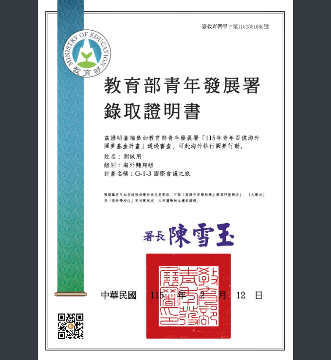 轉知教育部青年發展署「青年百億海外圓夢基金計畫」錄取證明書範本1份,請查照。Post author:hwaivsylc024Post published:2026 年 3 月 12 日Post category:學校公告教育部青年發展署「青年百億海外圓夢基金計畫」錄取證明書範本1份-來文下載教育部青年發展署「青年百億海外圓夢基金計畫」錄取證明書範本1份-附件下載 Post Views: 5相關內容主旨:檢送2025「第十二屆來自亞洲的設計力量」系列活動報名資訊,敬邀師生踴躍報名參與,請查照。2025 年 9 月 10 日函轉教育部115年性別平等教育日推動主題-「認識及尊重多元性別」相關課程與活動訊息。2025 年 9 月 26 日轉知學術交流基金會辦理「114學年度傅爾布萊特高中國際英語營-Bright Minds, Bright Futures」,請同學踴躍參與。2025 年 10 月 20 日