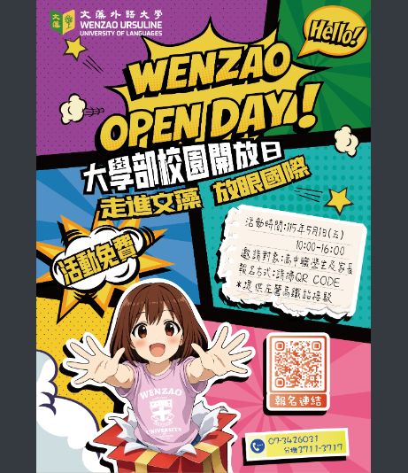 文藻學校財團法人文藻外語大學辦理115年大學部校園開放日活動海報,鼓勵同學踴躍參加!Post author:輔導室Post published:2026 年 3 月 24 日Post category:學校公告文藻外語大學 Post Views: 5相關內容轉知國立高雄師範大學115學年度「高齡產業經營學士原住民專班」招生資訊2026 年 3 月 4 日轉知環境部與彩晶文教基金會合作辦理之「綠影創作獎」相關資訊2026 年 1 月 28 日轉知原住民族委員會及財團法人原住民族語言研究發展基金會委託國立臺灣師範大學辦理「114年度第2次原住民族語言能力認證測驗」。2025 年 9 月 15 日