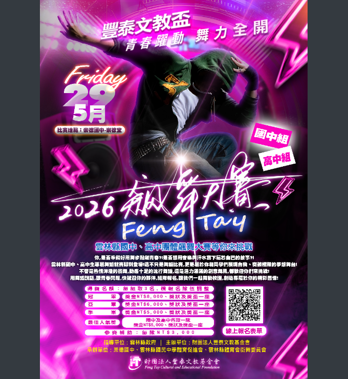 轉知財團法人豐泰文教基金會更正「2026豐泰文教盃雲林縣國/高中團體飆舞大賽」比賽時間,請查照。Post author:hwaivsylc024Post published:2026 年 4 月 2 日Post category:學校公告財團法人豐泰文教基金會更正「2026豐泰文教盃雲林縣國高中團體飆舞大賽」比賽時間-來文下載財團法人豐泰文教基金會更正「2026豐泰文教盃雲林縣國高中團體飆舞大賽」比賽時間-附件一下載財團法人豐泰文教基金會更正「2026豐泰文教盃雲林縣國高中團體飆舞大賽」比賽時間-附件二下載財團法人豐泰文教基金會更正「2026豐泰文教盃雲林縣國高中團體飆舞大賽」比賽時間-附件三下載財團法人豐泰文教基金會更正「2026豐泰文教盃雲林縣國高中團體飆舞大賽」比賽時間-附件四下載財團法人豐泰文教基金會更正「2026豐泰文教盃雲林縣國高中團體飆舞大賽」比賽時間-附件五下載 Post Views: 6相關內容113-2暑假愛校服務名單2025 年 7 月 2 日國立虎尾高級農工職業學校自編教科用書審查作業要點2023 年 5 月 23 日資安宣導事項請大家遵守2023 年 5 月 23 日