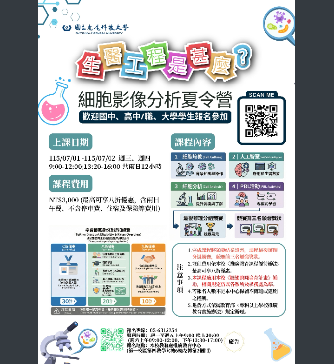 轉知國立虎尾科技大學教務處推廣教育中心辦理115年度「生醫工程是甚麼?細胞影像分析夏令營」活動,請查照。Post author:hwaivsylc024Post published:2026 年 4 月 8 日Post category:學校公告國立虎尾科技大學教務處推廣教育中心辦理115年度「生醫工程是甚麼?細胞影像分析夏令營」-來文下載國立虎尾科技大學教務處推廣教育中心辦理115年度「生醫工程是甚麼?細胞影像分析夏令營」-附件下載 Post Views: 5相關內容國立中正大學訂於114年9月、10月份辦理三場次「115學年度嘉星學生招生座談會」,敬請惠予公告並鼓勵貴校現職教職員踴躍參加。2025 年 7 月 24 日【期中考公告】114學年度第一學期第一次期中定期評量考程表2025 年 10 月 1 日轉知「114年教育部新世代環境教育發展(NEED)線上講座」相關訊息2025 年 7 月 15 日
