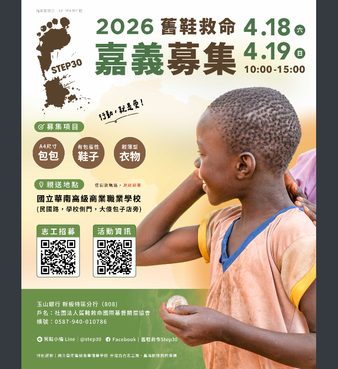 轉知社團法人舊鞋救命國際基督關懷協會於國立華南高級商業職業學校舉辦「2026 舊鞋救命嘉義親送募集」活動,歡迎踴躍報名參加。Post author:hwaivsylc024Post published:2026 年 4 月 9 日Post category:學校公告社團法人舊鞋救命國際基督關懷協會於國立華南高級商業職業學校舉辦「2026-舊鞋救命嘉義親送募集」活動-來文下載社團法人舊鞋救命國際基督關懷協會於國立華南高級商業職業學校舉辦「2026-舊鞋救命嘉義親送募集」活動-附件下載 Post Views: 6相關內容本校113學年度第2學期學生學習歷程檔案資料收訖明細確認期程及操作說明2025 年 10 月 2 日國家科學及技術委員會「2026 TechGiCS第6屆科技女婕思」活動簡章及說明簡報各1份,鼓勵同學踴躍參加!2026 年 3 月 16 日轉知國立自然科學博物館相關資訊,請查照。2025 年 10 月 7 日