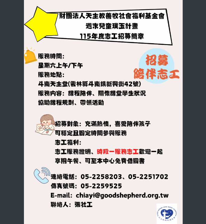 轉知財團法人天主教善牧社會福利基金會週末兒童璞玉計畫志工招募簡章乙份,歡迎踴躍報名參加。Post author:hwaivsylc024Post published:2026 年 4 月 10 日Post category:學校公告財團法人天主教善牧社會福利基金會週末兒童璞玉計畫志工招募簡章乙份-來文下載財團法人天主教善牧社會福利基金會週末兒童璞玉計畫志工招募簡章乙份-附件一下載財團法人天主教善牧社會福利基金會週末兒童璞玉計畫志工招募簡章乙份-附件二下載 Post Views: 10相關內容8月29日14:00~16:00一年級班級冷氣卡繳費通知2025 年 8 月 25 日Gemini AI 教育家認證研習-北區第一場鼓勵參加2026 年 1 月 29 日轉公告教育部委託製作之「海外留遊學消費權益維護」手冊,請廣為運用,請查照。2026 年 2 月 23 日