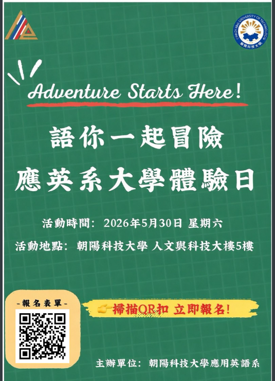 轉知朝陽科技大學應用英語系辦理「大學生活一日營」活動,歡迎踴躍報名參加。Post author:hwaivsylc024Post published:2026 年 4 月 14 日Post category:學校公告朝陽科技大學應用英語系辦理「大學生活一日營」-來文下載朝陽科技大學應用英語系辦理「大學生活一日營」-附件一下載朝陽科技大學應用英語系辦理「大學生活一日營」-附件二下載 Post Views: 7相關內容轉知教育部委請國立成功大學執行「美感智能閱讀計畫-安妮新聞」114學年度第2學期新進種子教師招募計畫書及辦理線上招募說明會。2025 年 12 月 3 日主旨:國立虎尾科技大學辦理「114年技職永續破風者計畫—技之勇者職業試探體驗系列活動:技職推廣市集」,敬邀貴校報名參與設攤推廣,請查照。2025 年 10 月 27 日公告edu磨課師+(教育部磨課師)平臺正確客服資訊2025 年 11 月 17 日