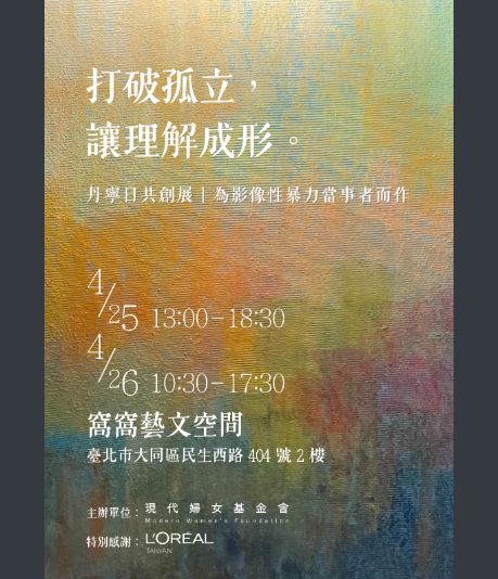 二、本展覽訂於115年4月25日(週六)至4月26日(週日),假「窩窩藝文空間」(臺北市大同區民生西路404號2樓)舉行。展覽規劃四大主題展區,包括「迷思拆解區」、「聲音故事區」、「議題理解區」與「行動出口區」,帶領大眾更進一步理解議題。