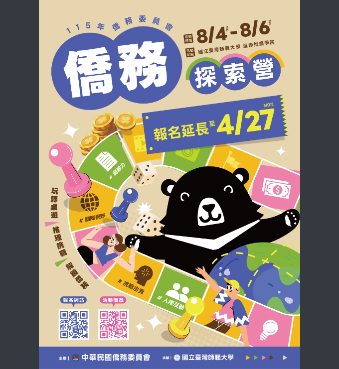 轉知國立臺灣師範大學辦理「115年僑務探索營」延長報名至115年4月27日止,歡迎踴躍報名參加。Post author:hwaivsylc024Post published:2026 年 4 月 20 日Post category:學校公告國立臺灣師範大學辦理「115年僑務探索營」延長報名至115年4月27日止-來文下載國立臺灣師範大學辦理「115年僑務探索營」延長報名至115年4月27日止-附件一下載國立臺灣師範大學辦理「115年僑務探索營」延長報名至115年4月27日止-附件二下載 Post Views: 6相關內容崑山科大辦理「iPAS資訊安全工程師(初階)證照班」,鼓勵參加2025 年 9 月 20 日轉知財團法人大學入學考試中心基金會大考中心115學年度各項考試開放應考資訊查詢2025 年 10 月 13 日AI 風雲錄系列線上講座2025 年 11 月 27 日