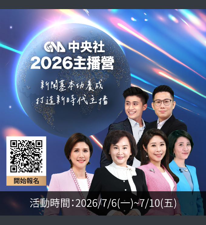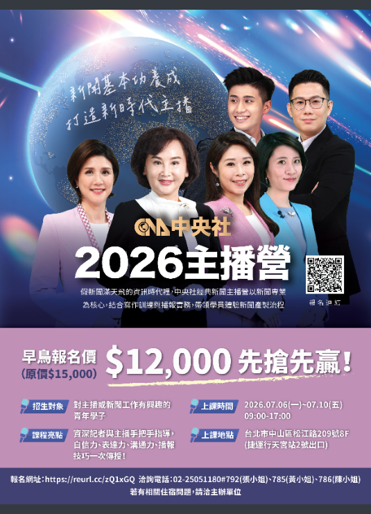 轉知財團法人中央通訊社舉辦「中央社2026主播營」活動,請查照。Post author:hwaivsylc024Post published:2026 年 4 月 22 日Post category:學校公告財團法人中央通訊社舉辦「中央社2026主播營」-來文下載財團法人中央通訊社舉辦「中央社2026主播營」-附件一下載財團法人中央通訊社舉辦「中央社2026主播營」-附件二下載 Post Views: 9相關內容弘光科技大學食品科技系舉辦「與食有約」研習營,鼓勵學生踴躍參加!2025 年 12 月 26 日轉知基隆市辦理「114學年度全國學生舞蹈比賽」決賽,貨物及大型道具載運車輛臨時通行管制路段一案,請查照。2026 年 1 月 29 日輔仁大學推廣教育中心 2026 寒假青少年工作坊《影像敘說與自我認識》,鼓勵學生踴躍報名!2025 年 12 月 18 日